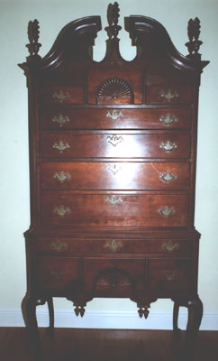 525.00 originally. The other photograph shows an open pediment highboy dresser